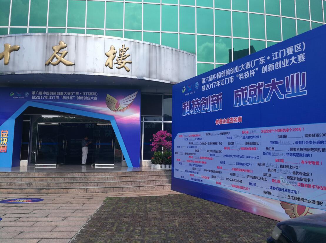 總決賽賽場--五邑大學十友樓門口的簽到墻獨具特色,“為企業定個小目標先拿100萬”、“需要融資500萬”等“豪言壯語”無不刺激著參賽企業的神經。進入大門,大堂往二樓的臺階上也貼滿了“創業從行動開始”、“創業改變未來”等口號,不斷激勵著參賽企業。