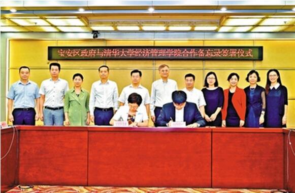 在清华经管学院院长钱颖一,深圳市副市长、宝安区委书记黄敏,区长姚任,区领导郭子平、高志远等见证下,副区长梁敏华与清华经管学院副院长陈煜波分别代表宝安区人民政府与清华大学经济管理学院签署合作备忘录。