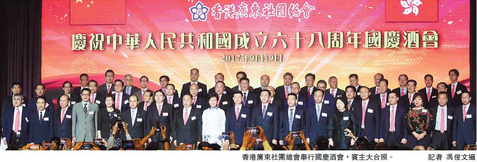 【香港商報网訊】記者曾美玲報道:香港廣東社團總會昨日假君悅酒店宴會大禮堂舉行「慶祝中華人民共和國成立68周年國慶酒會」,行政長官林鄭月娥、中聯辦副主任何靖、外交部駐港副特派員宋如安、駐港部隊副司令員田永江、政務司司長張建宗、廣東省委統戰部副部長李煥春、政制及內地事務局局長聶德權、民政事務局副局長陳積志、廣東省港澳辦副主任葉維園等應邀擔任主禮嘉賓,與該會同仁及嘉賓友好共同舉杯,祝願祖國繁榮富強、國泰民安,香港社會安定、百業興旺。