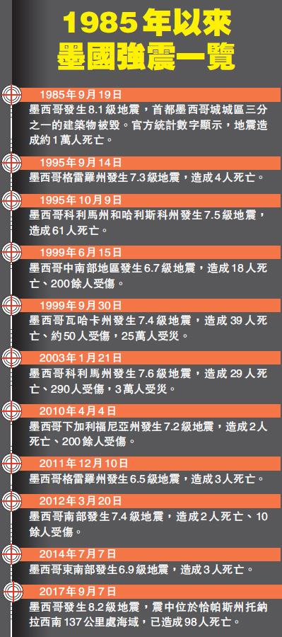 而1985年9月19日,墨西哥城也遭遇強震,由於震源較淺,且發生在人口密集地區,那次地震造成超過1萬人喪生,首都大量建築受損,是該國有史以來損失最嚴重的一次地震。此後墨西哥開始執行更為嚴格的建築物抗震標準,9月19日也被定為全國防災減災日。