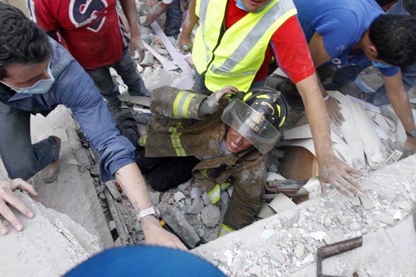 在墨西哥城,有志願者和救援人員在廢墟中尋找幸存者。在救援設備到位前,他們只能徒手刨出瓦礫碎石。在現場,救援人員舉起手,示意大家不要出聲,以便他們能更好地聽到廢墟下幸存者的呼叫。