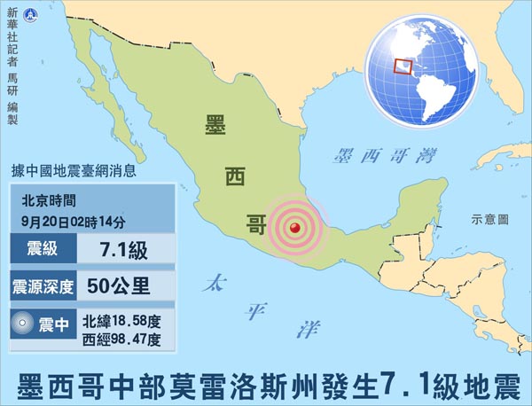 墨西哥中部莫雷洛斯州發生7.1級地震位置圖