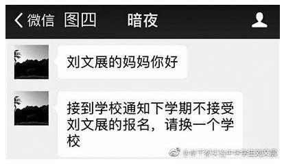 自今年3月7日开始,刘文展接连写信举报学校违规补课收费。本学期开学前,班主任以学校名义给其母亲发来一条微信:请刘文展换一个学校。校方随后回应,此举系班主任个人行为,并称已多次上门劝其返校,但刘文展拒绝返回学校继续上课。