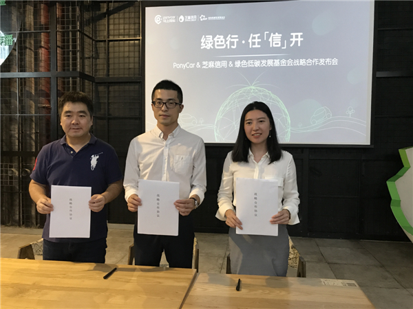 图一:PonyCar与芝麻信用、绿色低碳发展基金会签订战略合作