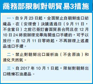 【香港商報網訊】聯合國安理會早前一致通過最新制裁決議案,懲罰朝鮮不斷核試和試射導彈。中國商務部22日晚宣布,為執行有關決議,昨天起全面禁止進口朝鮮紡織品,并禁止或限制對朝出口液化天然氣及石油產品。另外由10月1日起,中方將限制向朝鮮出口精煉石油產品。