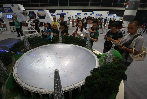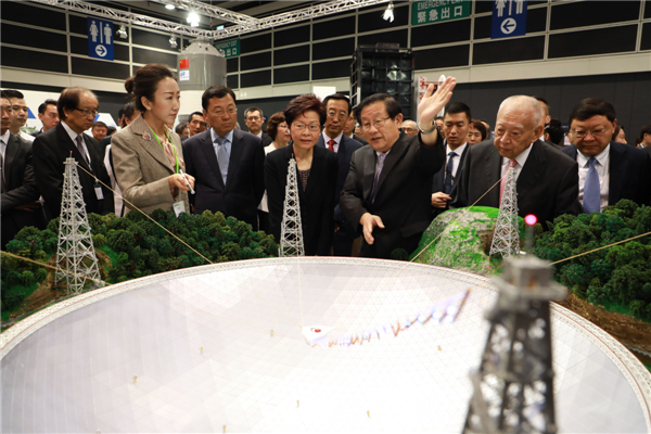 全国政协副主席董建华(前排右一),全国政协副主席、科技部部长万钢(前排右二),行政长官林郑月娥(前排右三)等参观博览会内的中国“超级天眼”模型。