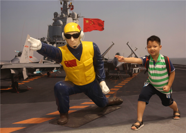 在“辽宁号”航母仿制甲板上,小朋友模仿加班调导员动作,“摆姿势”指挥战机升空。记者 冯俊文 摄