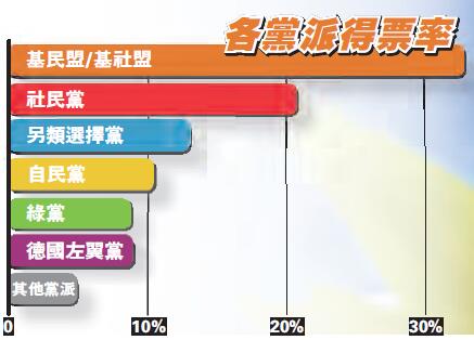 初步計票結果顯示,默克爾領導的聯盟黨獲得約33%選票,社民黨和另類選擇黨分別獲得20.5%和12.6%選票。聯盟黨和社民黨在此次大選中雖保住第一和第二大黨的地位,但比上一次選舉得票率均有下降。