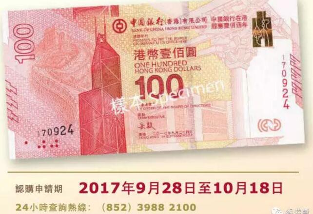 【香港商報网訊】記者邱媛媛報道:中銀香港(2388)「百年華誕紀念鈔票」終發行,面值為100元港幣,共500萬張,包括單張、三連張及三十連張,將於本周四至10月18日接受認購申請。此外,還有388套慈善珍藏版將以競拍方式發售,但稍后才公布具體銷售詳情。