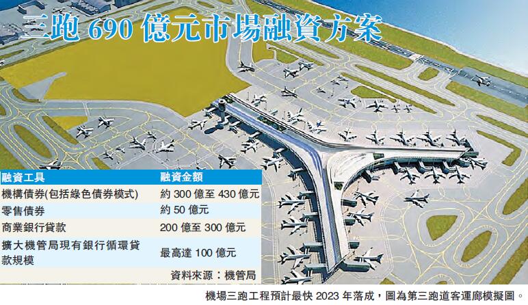 機場三跑道系統建造費高達1415億元,機管局建議透過保留機管局的營運盈餘(470億元)、徵收機場建設費(260億元)以及在市場借貸/籌集資金(690億元),為項目進行融資。機管局於去年委聘汇豐銀行就涉款690億元的詳細融資方案進行研究,并於昨日向立法會提交研究報告。