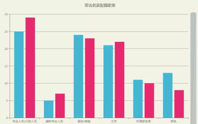 跨境婚姻中两方职业为行政/专业人员所占的百分比最多(红色为受访者、蓝色为受访者配偶)