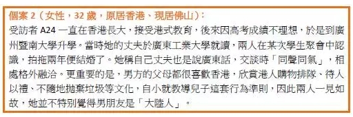 此外,还有许多大陆女性嫁来香港、取得香港身份证之后就会返回大陆居住,亦有家庭经常来往内地与香港两地,报告称,这显示出内地与香港的界线已经变得模糊。