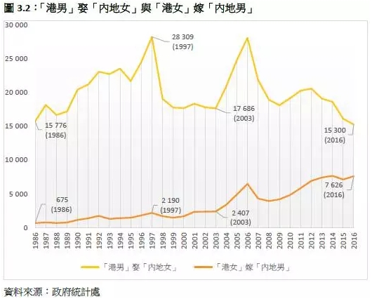 报告指出,近年香港女性嫁内地男性数目大增,由1997年的2190宗上升至2016年的7626宗,相反同期港男娶内地女性的数目则由28,309宗下降至15,300宗。