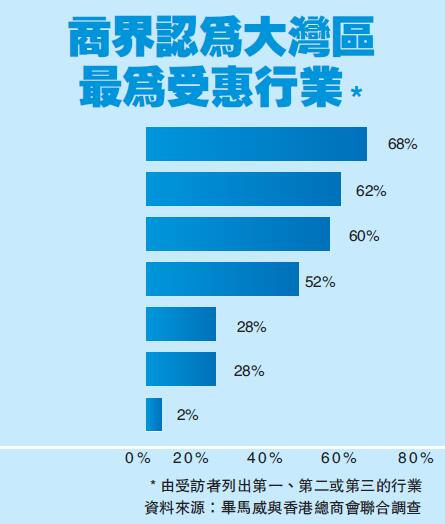 調查歷時兩個月,收到了來自香港(410人)、廣州(91人)、深圳(82人)及其他大灣區城市(31人)共614位企業管理層的回覆。受訪者重點指出,大灣區規劃可產生不少裨益,如增強企業的協同效應,帶來更自由的人才流動、更強的市場滲透能力等。貿易和物流業是被視為最有可能受益於大灣區發展的行業,其次是金融服務和創新科技。