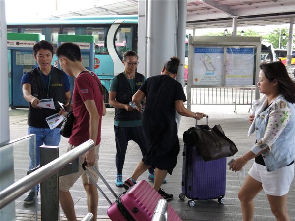 海关人员在过境巴士站提醒访港游客精明消费。
