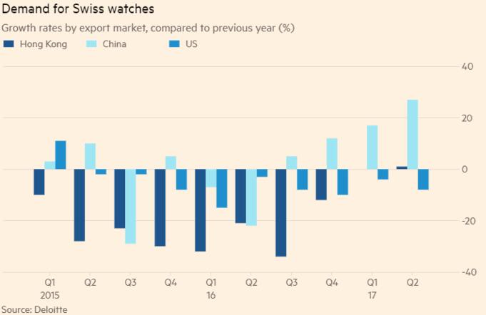 2017年,這些因素出現逆轉。根據瑞士鐘表協會(Swiss Watch Federation)的數據,截至8月份的8個月里,瑞士手表出口同比增長1.2%,對華出口增加19%。過去一年,斯沃琪集團(Swatch Group)和歷峰集團(Richemont)的股價分別上漲41.5%和47%。
