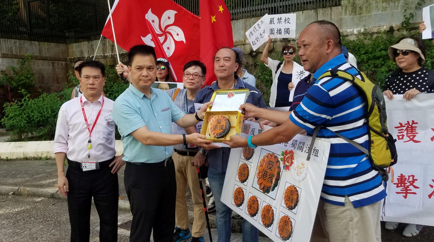 「反黑金·反港獨關注組」一行約20人昨日由遮打花園游行至律政中心,感謝律政司司長袁國強帶領律政司司法覆核「占中」、「議員DQ案」,讓違法者受到應有懲治,故藉中秋節向袁國強送「月餅」。關注組召集人黃引祥表示,「占中」至今已3年,只有少數人受到法律制裁,仍有不少人如「占中三丑」等逍遙法外。他又指「占中」后,有人變本加厲在社會宣揚「港獨」,甚至帶入校園,認為這是有某些「政棍」在炒作。
