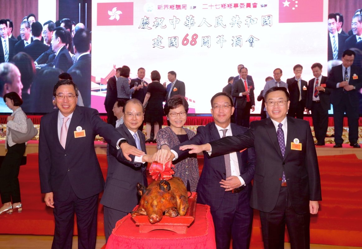 行政長官林鄭月娥昨早率領政府司局官員應邀出席新界鄉議局的慶祝國慶酒會,其他嘉賓還包括中聯辦副主任何靖、外交部駐港副特派員胡建中、立法會主席梁君彥,中聯辦新界工作部部長劉林及全國人大代表、政協委員等政商人士。鄉議局主席劉業強、副主席張學明、林偉強率領27鄉委會正副主席共數百人參加酒會。