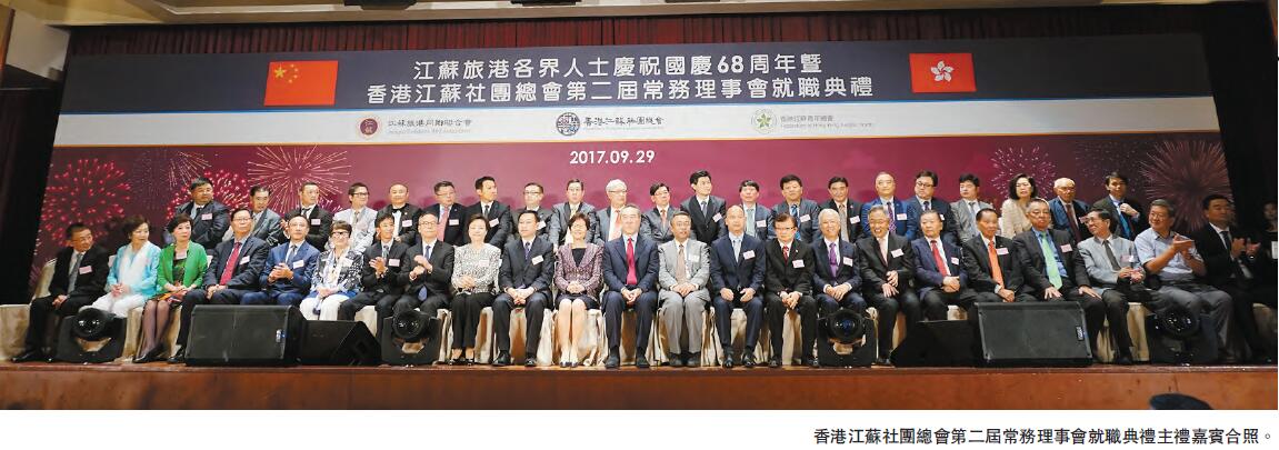 香港江蘇社團總會成立2年以來,致力團結會員,發揮江蘇在港人士的力量,組織不同經貿文化活動,促進香港與江蘇經貿交流,發揮紐帶橋樑作用。就職典禮上又安排不同演出助興,分別是保良局幼稚園舞蹈表演、蘇州總會舞蹈隊及中國武術總會拳術表演。晚宴尾聲,全體成員及嘉賓一同合唱《歌唱祖國》,把全場氣氛再一次推向高潮。