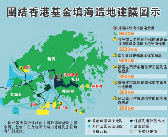 團結香港基金建議政府重啟大型填海計劃——除東大嶼都會外,長洲以南是本港唯一可作大規模填海的海域,可考慮填海逾2000公頃興建人工島;有關用地可考慮用作搬遷現有的葵涌貨櫃碼頭及棕地上的后勤物流作業,以騰出空間發展。至於現時葵涌貨櫃碼頭,連同周邊支援貨櫃碼頭作業的物流用地及政府建議填海的青衣南,合共占地近1000公頃,等於近兩個天水圍新市鎮,且位處市區,附近交通配套完善,可考慮改作以資助房屋為主的住宅發展以及其他的社會經濟民生的用途。