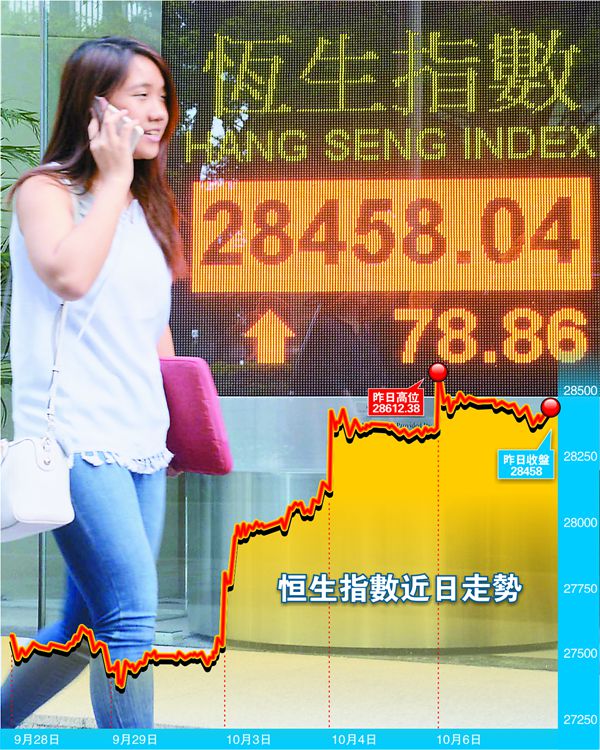 【香港商報网訊】記者邱媛媛報道:本周國慶中秋雙節至,港股「夾縫」開市,穩步紮營升勢喜人,終於在昨日爆發,曾一舉冲破「大時代」28588點高位,至28626點,創近10年高位。后受濠賭股拖累,升幅收窄,最終收報28458點,升78點或0.28%。市場人士認為,現時港股表現异於「大時代」,不過還有上行空間。