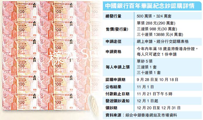 中銀香港推出紀念鈔,售價由288元至13888元不等,認購時間由上月28日開始至10月18日截止。據悉,今次紀念鈔發行總數為500萬張,發行量為歷年最多,共324萬套,包括290萬套單鈔。每套售價288元,30萬套3連張售價988元,4萬套整版30連張售價13888元。