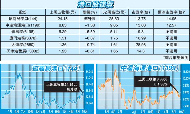 中國進出口貿易改善,加上「一帶一路」發展,港口股的前景轉好。在上周五港股升勢持續下,多隻港口股跟隨大市向上,中遠海運港口、大連港(2880)、青島港(6198)及廈門港務(3378)分別升1.38%、0.74%、5.59%及0.67%。