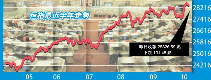 【香港商報网訊】記者吳天淇報道:A股長假期后復市造好,無助港股延續升勢,恒指收市跌131點或0.46%,報28326點,開始回補上周三的上升裂口;國企指數則跌0.64%,收報11385點,大市全日成交977億元,本周股市料繼續受環球政治因素主導。