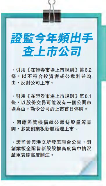 事實上,今年來,證監會更多實施「前置式」的監管方式,即跑在問題發生之前,直接介入處理落入證監職責範圍的上市事務。上月公布的上市監管決策及管治架構諮詢總結亦顯示,證監在處理上市申請時,會改為直接與保薦人或上市申請人接觸,以及在早階段提出反對。