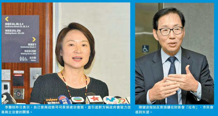 【香港商報网訊】記者戴合聲報道:隨立法會新一年度會期展開,各個委員會陸續開會。立法會內務委員會主席李慧攌昨日於會上表示,自己曾與政務司司長張建宗會面,并引述對方稱政府會致力改善與立法會的關系;李慧琼亦已邀請張建宗與議員會面,對方說樂意與不同黨派討論;立法會財務委員會主席陳健波則稱,將會就推出主席指引舉行交流會,他重申如果財委會繼續「拉布」,市民會非常失望。