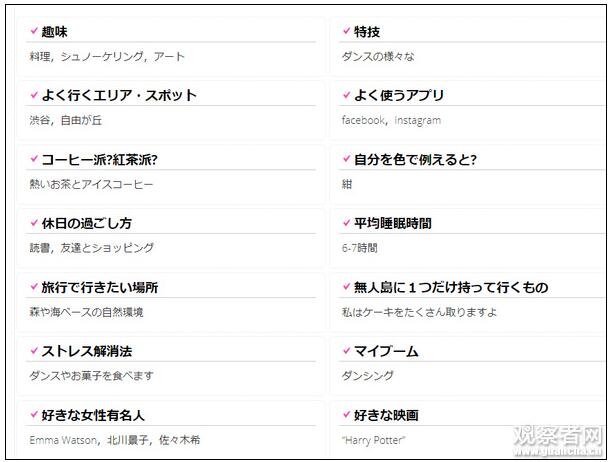 她擅长舞蹈,兴趣爱好是料理、浮潜和艺术,喜欢的电影是哈利波特,爱喝红茶和冰咖啡。