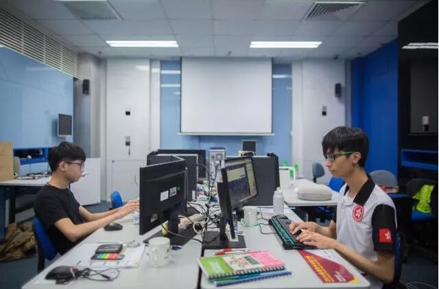 赛前,陈奕希(右)于IVE校园内一间电脑室进行训练