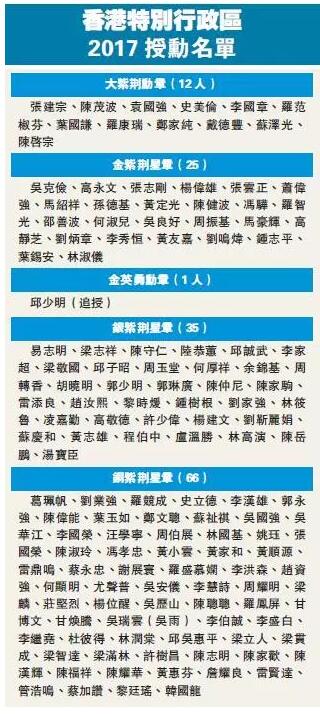 2017年度勋衔颁授典礼20日在香港礼宾府宴会厅举行,行政长官林郑月娥颁授勋衔和奖状予331人,其中12人获颁最高荣誉的大紫荆勋章,是自1997年后最多,当中包括3位司长张建宗、袁国强和陈茂波,但陈茂波因外访越南缺席。