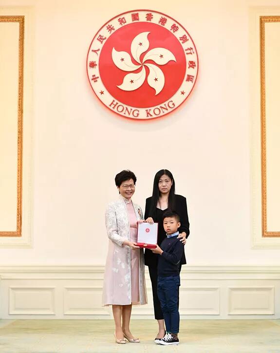 邱少明的妻子及儿子接受林郑月娥追授予邱少明的金英勇勋章