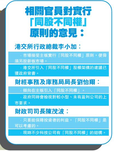 財經事務及庫務局局長劉怡翔亦於前日出席活動后表示,正在跟證監會和港交所分析諮詢結果,傾向在主板引入「同股不同權」,待有共識后會公布修訂諮詢文件。他又表示,政府同時會檢視對較小型、未有盈利公司的上市要求,并會討論對這些企業的上市,運用何種方式或設立怎樣的門檻。