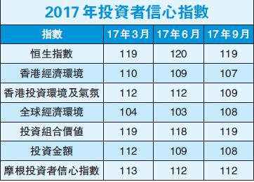 摩根資產管理昨日發表「摩根投資者信心指數」第三季調查結果,9月份的整體指數維持於112點,指數在2017年皆維持在此水平。摩根資產管理零售分銷業務副總裁湯志恒指,整體指數及其他分類指數,自2017年開始便維持平穩或稍微回落,這可能反映雖然投資者確認經濟環境穩固,但仍然擔心因估值上升而可能出現的市場調整。香港商報記者 林德芬
