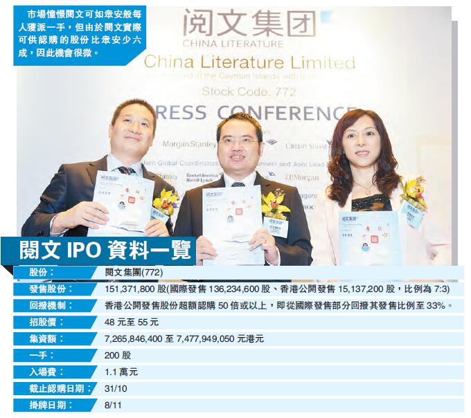 根據閱文的回撥機制,當在港公開發售的股份超額認購50倍或以上,就需要從國際配售回撥股份,屆時在港公開發售股份比例將提升至33%。驟眼看來,與上月底眾安招股比較,在港公開發售股份最多可回撥至20%,閱文在港公開發售股份的比例明顯較高,故市場憧憬可如眾安般,每人獲發一手新股。然而,由於閱文是以200股為一手,故實際可供認購的股份只有最多約25萬手,比眾安的約40萬手少六成。即使今次新股認購人數與眾安一樣,都是12萬人,每人派一手的話,其實已占可供認購的股份近一半,因此每人獲派一手的機會很微。