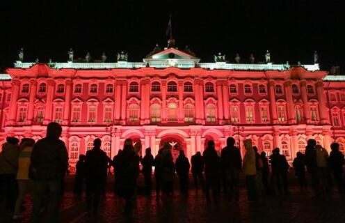 資料圖片:10月25日,俄羅斯聖彼得堡冬宮外牆亮起紅色燈光,紀念十月革命100周年。新華社發