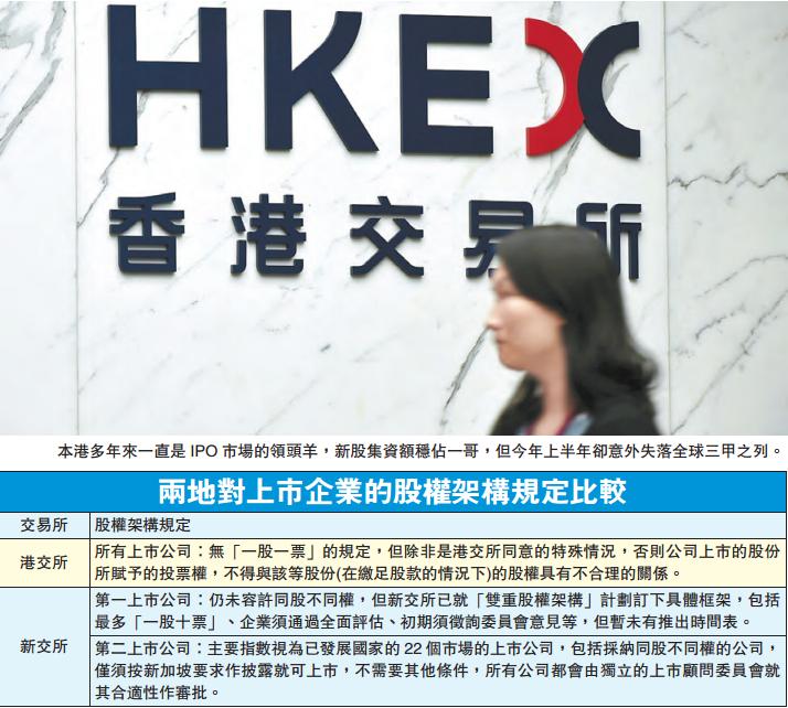 本港多年來一直是IPO市場的領頭羊,新股集資額穩占一哥,但今年上半年卻意外失落全球三甲之列。市場人士認為,政府在三年后重提同股不同權,是為了吸引更多外資來港進行IPO,提升香港競爭力。然而,區內競爭對手新加坡亦對IPO市場虎視眈眈,新交所副總裁林榮顯上月底就曾表示,考慮同股不同權企業作第一上市,表面看來新交所或有跟風之嫌。