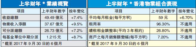 與南豐於九龍東海濱道77號的合營發展項目「海濱匯」,建造工程如期推進。摩根大通已成為主要租戶并已同意租用超過25萬平方尺地,目標提前於2019年年初完成建造工程。至於內地的北京歐美匯購物中心、上海領展企業廣場、廣州西城都薈廣場,王國龍稱,上半財年帶來收益總額及物業收入净額分別達3.99億元及3.1億元,分別按年增加38.1%及33.6%。