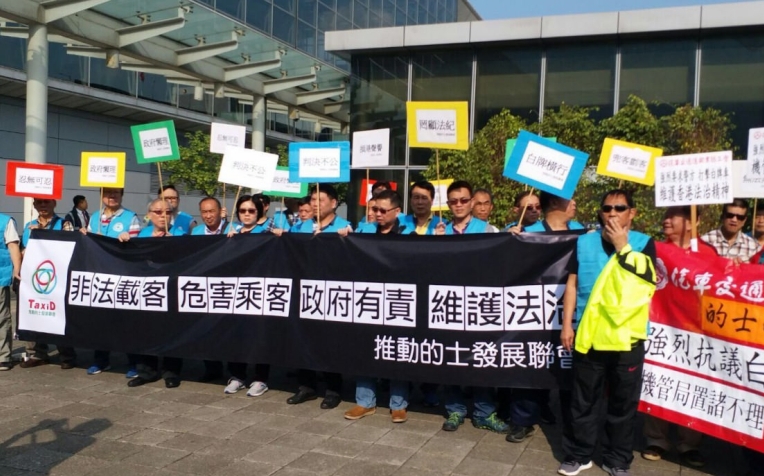 昨日下午約3時,約50名的士司機到機場示威,抗議白牌車和Uber損害業界利益,在接機大堂舉起橫額及示威標語,高呼:「白牌車橫行,罔顧法紀。」的口號。