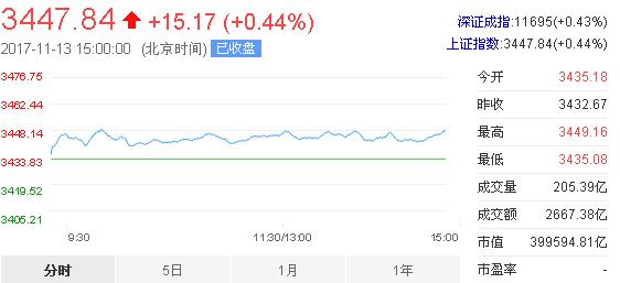 周一,市場震蕩走高,滬指、深成指、中小板指均創出年內新高。題材股繼續活躍,滬指已出現連續6天的陽線。截止收盤,上證指數報3447.84點,漲幅0.44%,成交金額2667億元;深證成指報11695.00點,漲幅0.43%,成交金額3298億元。創業板指數報1906.44點,漲幅0.31%。