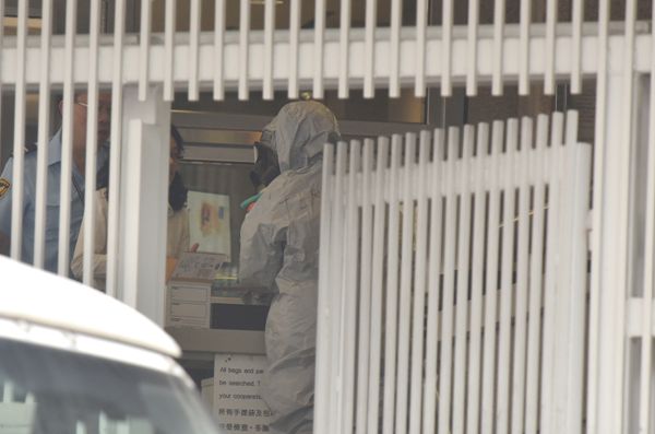警員穿著防生化保護衣服進入領事館。