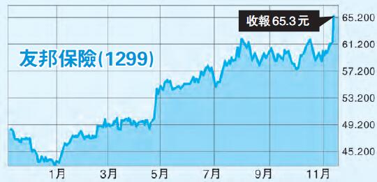 反而,友邦保險(1299)急升逾6%,高收65.3元,貢獻恒指141點。友邦早前公布第三季新業務價值增長20%,首三季按固定匯率增34%,符合市場預期,且獲多間大行重申買入評級;不過,股價於績後短暫受壓,並於58元附近完成整固,昨配合大成交上破62元阻力,隨大市展開一輪升浪。大摩認為,內地放寬外資持股限制,有利友邦未來在內地拓展銷售領域,未來潛在價值得以反映,基本情況下,估值將升至71元,若限制全面放寬,估值將可升至97元,予其「增持」評級,目標價75元,謂最牛可見97元。