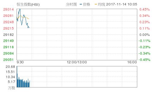 隔夜美股三大指數輕微高收,道指標普結束兩連跌,通用電氣(GE)股價跌至5年低位。芯片制造商高通(Qualcomm)拒絕競爭對手博通(Broadcom)1030億美元(約8034億港元)的收購建議,指對方提出的收購價嚴重低估了高通價值。美國財政部公布,10月財政赤字為630億美元,較去年同期少170億元。上月,美國財政開支升12%,收入升6%。根據財政部的報告,10月開支上升,是因為國土安全與教育經費增加;收入上揚是受惠于個人入息稅收入增長。恒生指數今早高開0.31%,報29272.1點;國企指數高開0.08%,報11694.3點;紅籌指數高開0.06%,報4420.13點。