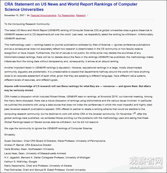 CRA的声明对象正是全球计算机研究团体。声明称,USA&WR的相关排名对它的读者以及全球计算机科研单位造成了严重困扰。上周,CRA曾经诚恳地要求USN&WR撤销这份排名,但是被拒绝了。