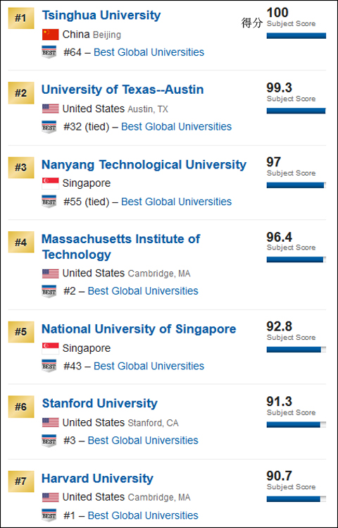 在计算机科学(Computer science)方面,清华大学取代麻省理工摘得桂冠。此外,华中科技大学和浙江大学的计算机专业分列第9和第10。香港城市大学、上海交通大学和东南大学则分别排名第12、17和20名。
