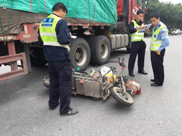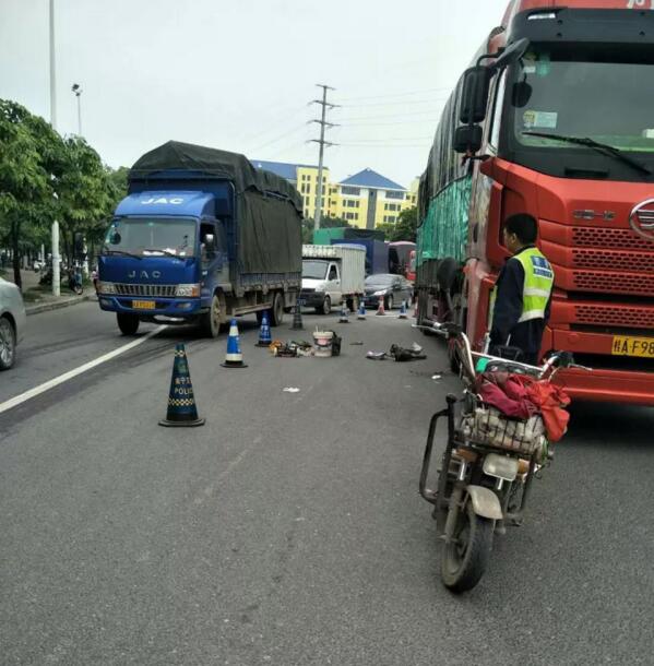 在上一起事故发生约两小时后,在南宁市昆仑大道往秀厢大道邕宾立交桥上,也发生一起货车与电动车相撞事故!