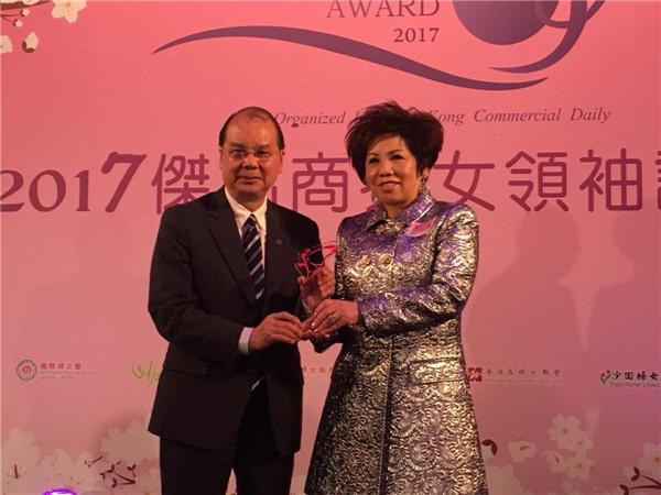 莎莎國際副主席郭羅桂珍(右)從香港政務司司長張建宗手上接過《卓越商界女領袖大獎》。