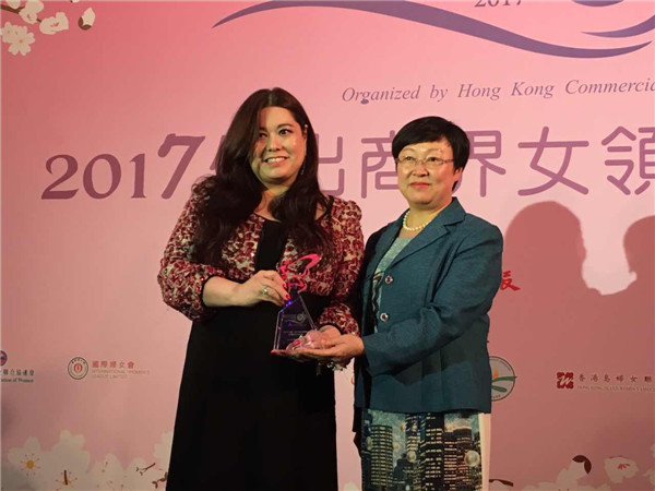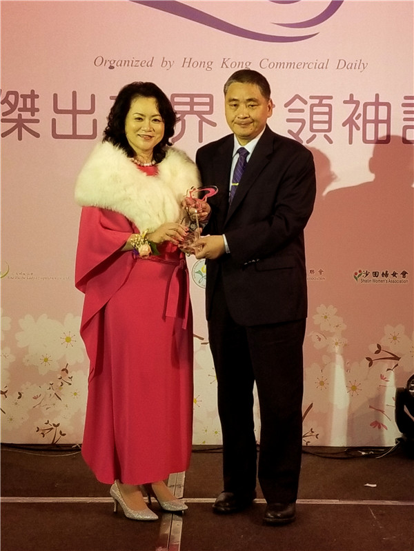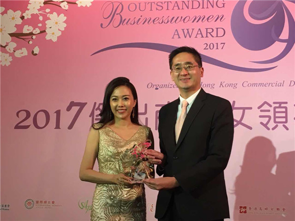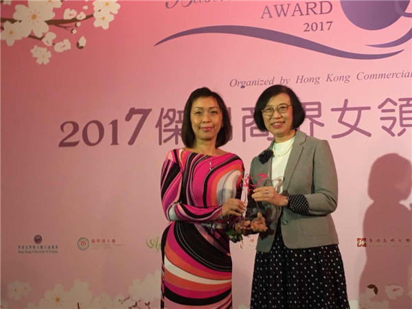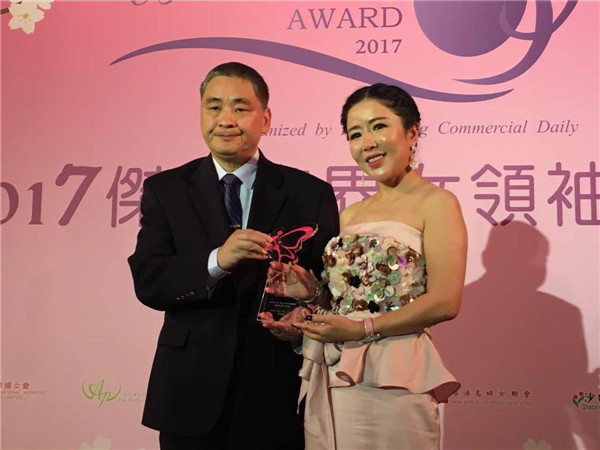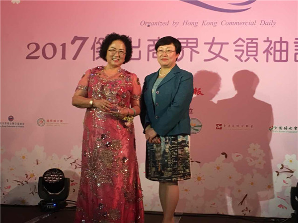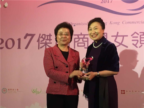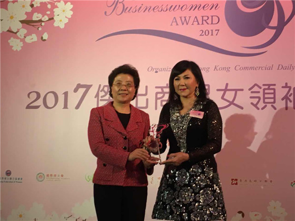 安基司國際教育主席蔡李惠莉(右)從香港中聯辦副主任仇鴻女士手中接過《卓越商界女領袖大獎》。